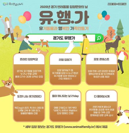 이은경 동물보호과장은 “이전에는 ‘반려동물 입양문화의 날’과 같은 오프라인 행사로 도민들의 참여를 유도했지만, 올해는 코로나19 예방과 보다 많은 사람들의 참여를 위해 온라인 플랫폼을 운영하게 됐다”며 “재미있고 다채로운 콘텐츠로 올바른 반려동물 문화를 정착하는데 힘쓸 것”이라고 밝혔다.