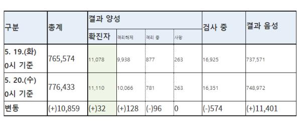 [한국4차산업신문] 질병관리본부 중앙방역대책본부(본부장 정은경)는 5월 20일 0시 현재, 신규 확진자가 32명 발생하여 총 누적 확진자수는 11,110명(해외유입 1,189명(내국인 89.0%))이라고 밝혔다.