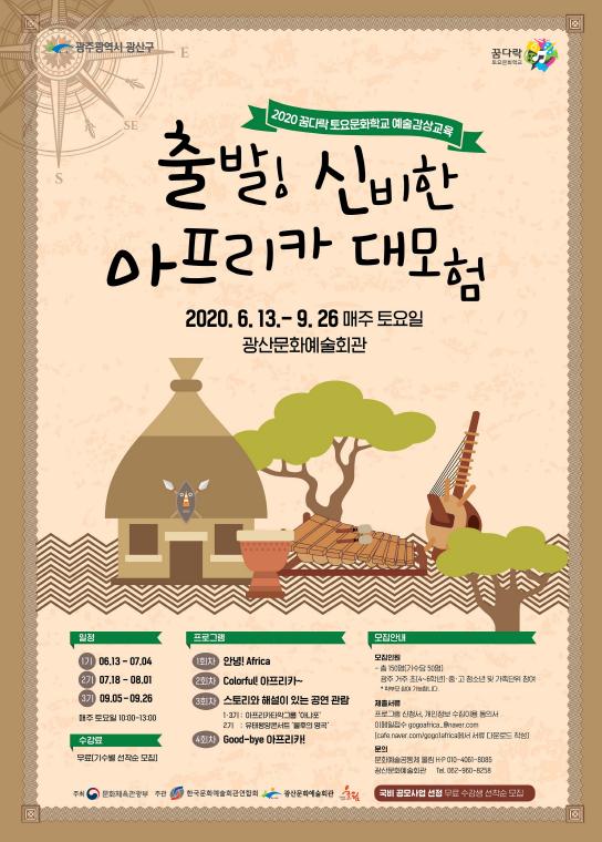 이번 프로그램은 아프리카 전통춤과 악기 연주 체험학습, 아프리카 전통공연 감상, 공연관람 예절교육 등으로 꾸며져있다. 수업은 6/13~7/4일 중 매주 토요일 오전 광산문예회관과 광산구청에서 총 4회 열린다.