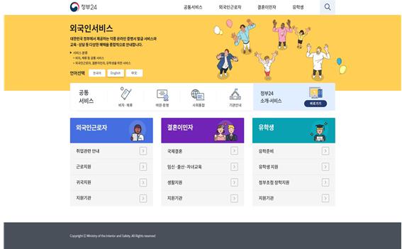 행안부는 이러한 불편을 해소하고자 국내 거주에 필수적인 체류신고·국적증명 등 민원서비스와 한국어 무료교육 등 혜택 정보를 한 곳에서 제공 받을 수 있도록 ‘정부24’포털 내에 외국인 주민 전용 사이트를 개설하여 외국인의 정부 서비스 이용 편의를 대폭 개선했다.