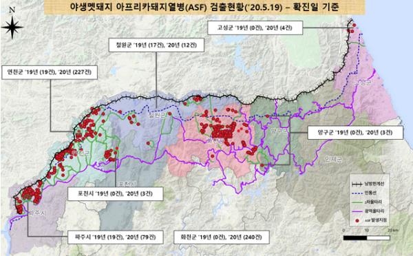 환경부(장관 조명래)는 지난 일주일간(5월 13일~19일) 경기도 파주시, 연천군과 강원도 화천군에서 아프리카돼지열병 11건이 추가로 발생하여 현재까지 총 623건이 발생했다고 밝혔다.
