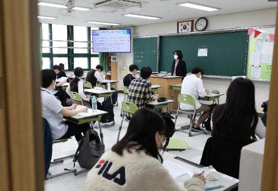 이날 학생들이 선생님의 안내로 손소독, 발열체크를 하고 교실에 들어가 코로나19관련 학교내 생활수칙을 설명 듣고 차분히 수업을 받고 있다.