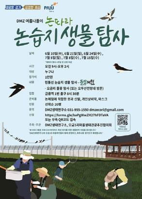 [한국4차산업신문] 파주시는 DMZ생태연구소와 탄현면 오금1리 주민들이 운영하는 ‘DMZ 여름나들이-논습지 생물탐사’탐방객들을 모집한다고 22일 밝혔다.