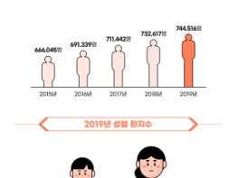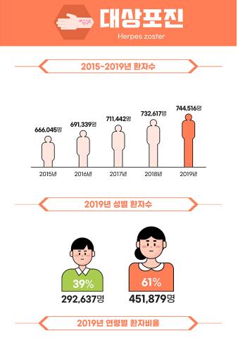 건강보험심사평가원의 통계자료에 따르면 2019년 대상포진으로 진료를 받은 환자 수는 74만 4516명입니다. 이는 2015년 대비 약 11% 증가한 수치입니다. 남성 환자보다 여성 환자가 61%로 더 많았고, 50~60대 환자가 전체 환자의 45%를 차지할 정도로 많았습니다.