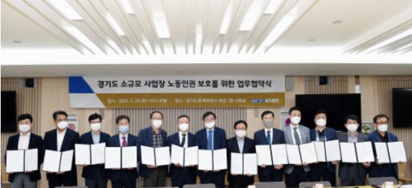 경기도와 고용노동부 경기지청, 고양·부천 등 6개 시군, GS리테일, 롯데GRS, BGF리테일, 코리아세븐, 한국미니스톱 등 편의점 프랜차이즈 5개사는 26일 경기도청 북부청사에서 ‘노동권익 서포터즈 활동지원 업무협약’을 체결했다.