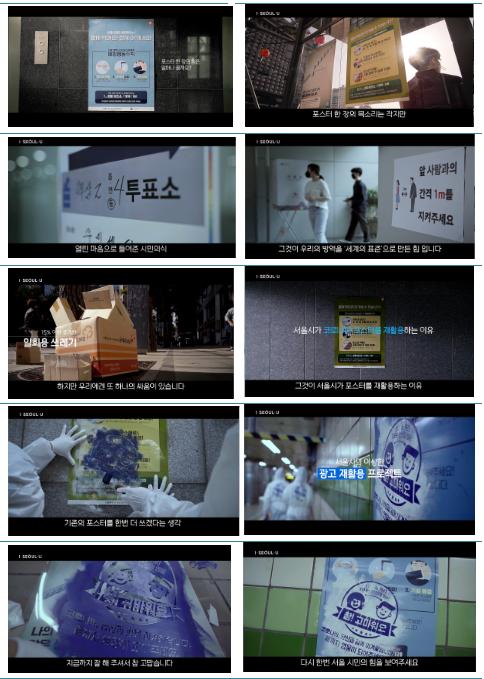 이번 재활용 캠페인은 코로나19 대응 과정에서 급증하고 있는 일회용품 등의 사용을 최대한 줄이기 위해 서울시내 35개 지하철역에 부착된 코로나19 초기 포스터 2,000여장을 그대로 활용하여 시민들에게 감사인사와 지속적인 생활 속 거리두기 메시지를 전달하고 있다.