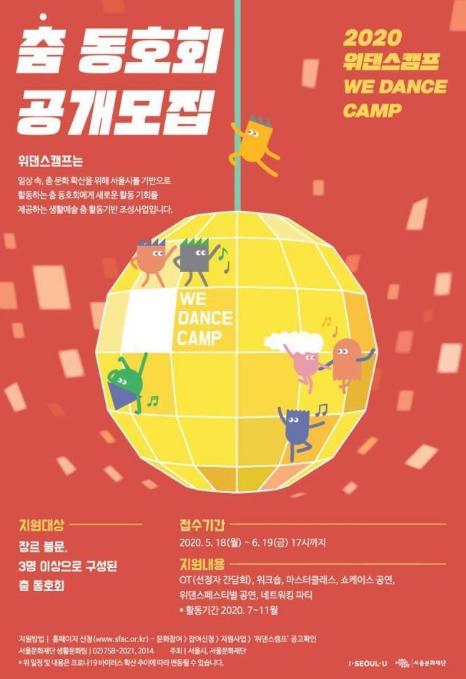 <위댄스캠프>는 새롭고 특별한 경험을 하고 싶은 춤 동호회가 참여 대상이다. 서울에서 활동하는 3인 이상의 춤 동호회라면 연령과 장르의 구분 없이 누구나 지원할 수 있으며 서류와 영상 심사를 통해 최대 50팀을 선정한다. 참여를 희망하는 춤 동호회는 오는 6월 19일(금)까지 서울문화재단 누리집(www.sfac.or.kr)을 통해 접수하면 된다. 선발된 팀은 오는 7월부터 10월까지 ▲쇼케이스(동호회 합동공연) ▲마스터클래스 ▲위댄스 페스티벌 기획?출연 등에 함께 참여하며 원하는 무대를 직접 기획할 수 있다.