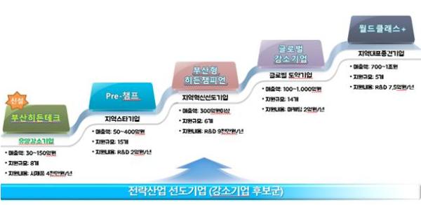 부산형 강소기업 성장사다리 육성은 「중소→중견→글로벌기업」으로의 성장생태계 구축을 통한 부산경제의 혁신성장과 지역발전을 주도할 강소기업 육성을 목적으로 하고 있다.