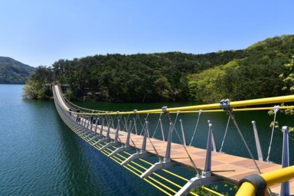 옐로우 출렁다리와의 가장 큰 차이점은 구조다. 황금빛 출렁다리에는 다리 양 쪽을 지탱하는 주탑이 없는 ‘무주탑’ 방식이 적용됐다. 케이블이 주탑 대신 지면에 고정된 강재 구조물에 연결되어, 다리 한가운데로 갈수록 수면과 가까워진다. 군 관계자에 따르면 다리 중앙부 높이가 수면으로부터 불과 2~3m 정도여서 더욱 짜릿한 스릴을 만끽할 수 있다.
