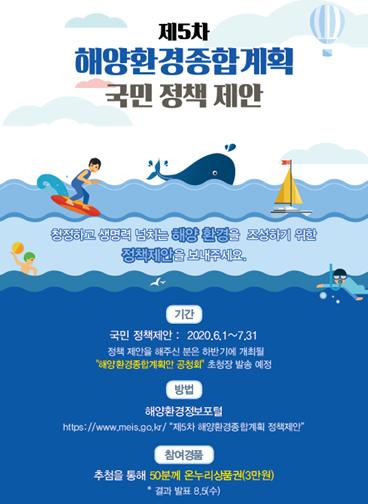 해양수산부(장관 문성혁)는「제5차 해양환경종합계획」에 국민들의 목소리를 담기 위해 6월 1일부터 7월 31일까지 해양환경정보포털 누리집(www.meis.go.kr)을 통해 국민이 바라는 해양환경에 대한 의견을 수렴한다.