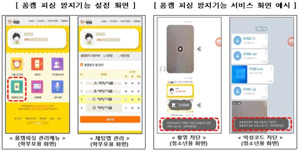 몸캠피싱 방지기능은 청소년이 채팅앱 내에서 카메라를 켤 경우 이를 차단하는 기능과, 채팅 상대방의 악성코드 파일 설치를 막기 위해 파일 다운로드를 차단하는 기능으로 이루어져있다. 몸캠피싱 방지 기능이 적용되는 채팅앱은 학부모가 자율적으로 선택할 수 있다.