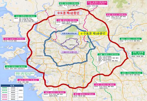‘서울외곽순환고속도로’는 경기(고양·파주 등 14개 시군), 서울(송파·노원 등 3개구), 인천(부평·계양 등 3개구) 3개 광역자치단체와 20개 기초 지자체를 경유하는 총 128km의 왕복 8차로 고속도로로, 수도권 1기 신도시 교통난 해소를 위해 1988년 착공해 2007년 완전 개통됐다.