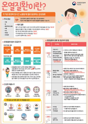 또한, 쪽방촌 등 폭염에 열악한 주거환경에 놓여 있는 취약계층과 노인, 어린이, 만성질환자, 거동이 어렵거나 보살핌이 필요한 분들께는 지자체에서 건강수칙을 전파하고 거주 환경을 살피고, 가족, 이웃들도 수시로 안부를 확인하는 등 각별한 관심을 당부했다.