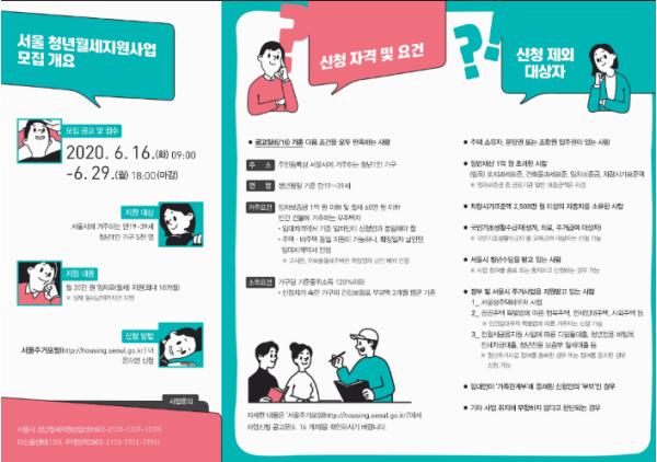 서울시는 16일(화)부터 29일(월)까지 서울주거포털(http://housing.seoul.go.kr)에서 ‘서울 청년월세지원’ 신청접수를 받는다고 밝혔다. 7월 중 소득재산 의뢰?조사를 거쳐 8월에 지원대상자를 발표하고, 9월부터 지원금 지급을 시작한다.