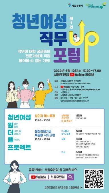 서울시와 서울시여성능력개발원은 6월 12일(수) 13시, 유튜브 <서울우먼업> 채널에서 라이브로 ‘청년여성 직무업(Up) 포럼’을 개최한다.