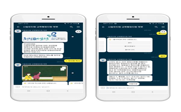 사립유치원 교육행정지원 챗봇은 카카오톡에서 검색 후 채팅을 통해몇 번의 클릭으로 각종 업무 처리가 가능하도록 도와준다. 챗봇 개발 노하우를 살려 감사팀 직원들이 자체 개발하여 예산을 절감(5백만원) 하였으며, 이용자가 각종 서식 등 관련 자료를 간편하게실시간으로 확인할 수 있도록 하여 활용도를 높였다.