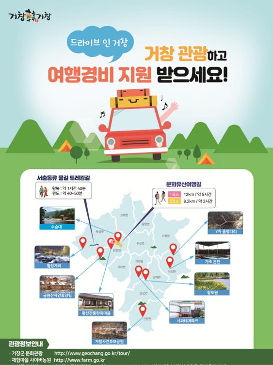 ‘드라이브 인 거창’ 프로그램은 거창군 관광지와 농촌체험휴양마을?농어촌민박을 이용한 타 지역 가족단위 관광객에게 여행경비의 일부를 지원하는 사업이다.