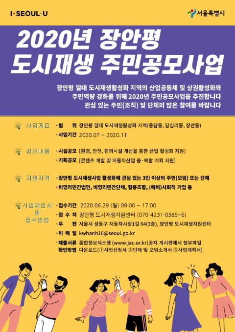 서울시는 시 홈페이지 및 보조금관리시스템에 6월 12일~ 29일(월)까지 ‘2020 장안평 일대 주민공모사업’ 의 개요 및 심사·선정 방법을 공고한다.