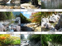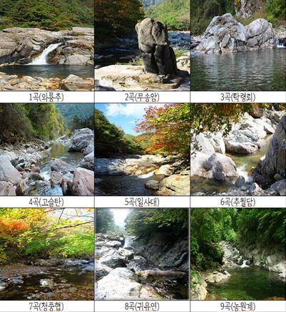 1곡 와룡추를 시작으로 9곡 농원계까지 약 6km 코스의 탐방로는 훼손돼지 않은 청정 생태계와, 구슬 같이 맑은 물, 계곡마다 병풍처럼 펼쳐지는 기암괴석들로 마치 신선 세계에 온 것 같은 신비감을 더해준다