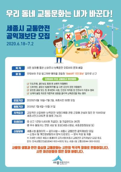 세종특별자치시(시장 이춘희)가 관내 신호무시·인도주행 등 불법운전 오토바이를 감시하는 ‘세종시 교통안전 공익제보단’을 모집한다.