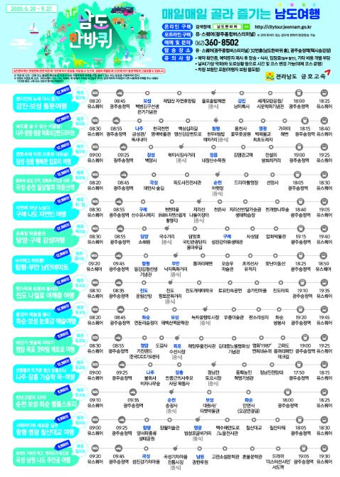 남도한바퀴 여름상품은 우선 ‘코로나19’에 따른 실내관광지에서 개방된 야외관광지와 숨겨져 있던 보석같은 명소 등을 여행지로 편성, 승차인원을 45좌석에서 20좌석으로 축소해 거리두기 좌석운영을 시행할 방침이다.