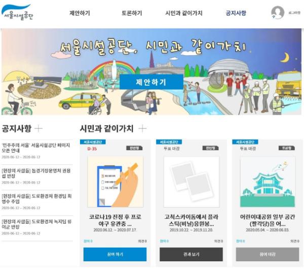 새롭게 공개된 서울시설공단의 웹페이지는 ?제안하기 ?토론하기 ?‘시민과 같이가치’ 등 3개의 메뉴로 구성되어 있다. ‘제안하기’에서는 시민들이 공단 사업장 운영에 관해 다양한 제안을 할 수 있다. 시민들의 제안은 약 30일 동안 숙의 과정을 거치며, 이 기간 중 50개 이상의 공감수를 얻으면 해당 부서로 이관된다. 해당 부서에서는 30일 동안 채택 여부를 검토하고 답변한다.