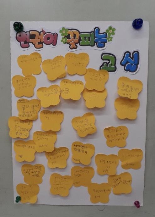 학생들이 장애인의 인권을 지키기 위해 스스로 할 수 있는 일을 메모하여 큰 도화지에 붙이고, 학급 구성원들이 함께 약속하는 시간을 가져 모든 사람이 소중하다는 인식을 향상시키는 데 큰 도움을 주었다.