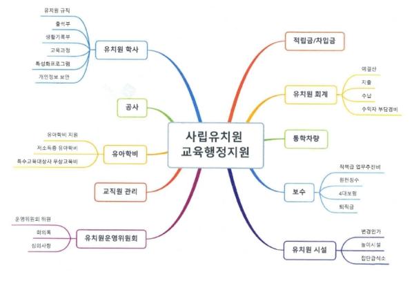 사립유치원 업무를 10개 업무로 구분하였고 FAQ 방식(미리 질문 범주화)과 API 방식(이용자가 개별적으로 질문) 방식을 병행하여 수요자가 궁금해 하는 질문?답변 위주로 구성하였으며 감사결과, 업무편람 등 기존에 산재해 있던 각종 사립유치원 관련 자료를 분석하여 일목요연하게 정리하였다.