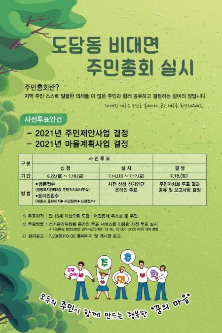 도담동은 코로나19의 지역사회 확산을 방지하고자 올해 주민총회를 선거관리위원회 온라인 투표 서비스를 이용해 비대면 방식으로 진행하기로 했다.