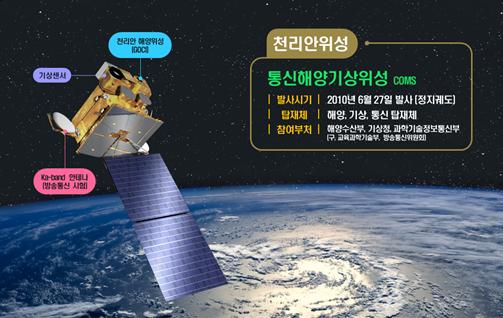 지난 2010년 6월 27일 발사된 천리안 1호는 해양수산부와 과학기술정보통신부,기상청의 협력 사업으로 개발된 정지궤도 위성으로, 세계 최초로 해양·통신·기상 등 3개의 탑재체를 장착하여 해양감시 및 기상변화 관측임무를 수행하고 있다.