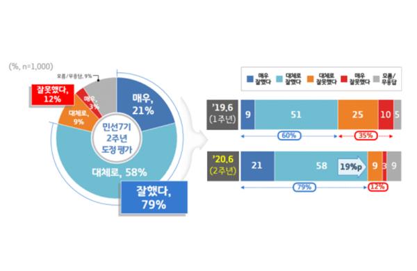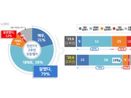 그밖에 ▲청년기본소득 등 청년정책 사업(69%) ▲북부 도로인프라 개선 등 지역균형발전(66%) ▲미세먼지 계절관리제 등 환경개선 사업(65%) ▲공공건설공사 원가공개 등 주거안정 및 부동산 정책개혁(60%) 등의 사업도 높게 평가됐다.