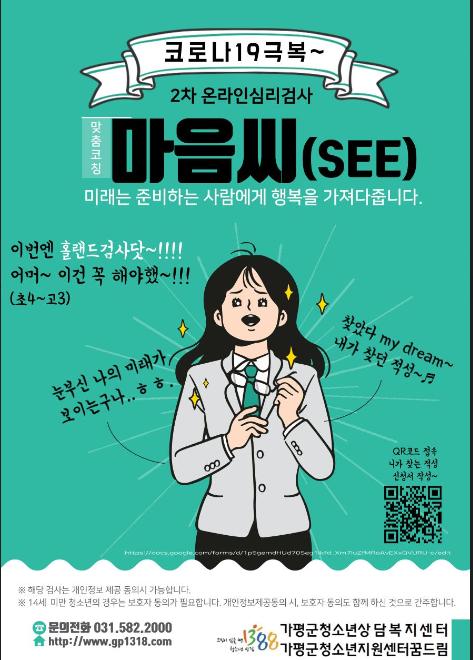 가평군청소년상담복지센터(센터장 김영환)는 최근 코로나19 재확산으로 인하여 방역조치가 강화됨에 따라 청소년들을 위해 제2차 청소년 온라인 심리검사 마음씨(see)를 진행한다.