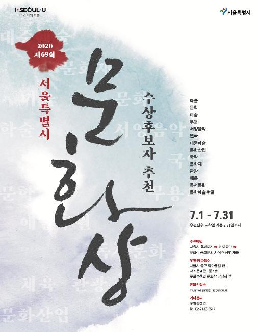 [한국4차산업신문] 서울시는 서울의 문화발전에 기여한 공적이 큰 시민 또는 단체를 발굴하여 문화·예술인들의 활동을 촉진하고, ‘문화시민도시 서울’의 위상을 높이고자 7월 1일(수)~7월 31일(금) <제69회 서울특별시 문화상> 수상 후보자를 공개 모집한다.