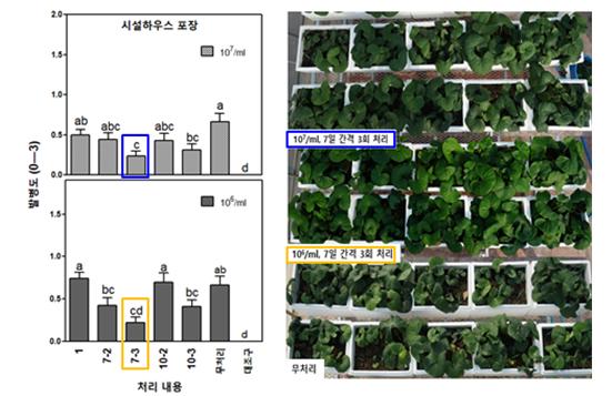 또한 시설하우스 포장에서 106/㎖ 농도의 ObRS-5 미생물 배양액을 곰취 어린 모종에 7일 간격으로 3회 처리한 결과, 역병 발병률은 7.5%로 나타나 처리하지 않은 곰취보다 발병률이 66.3% 줄었다.