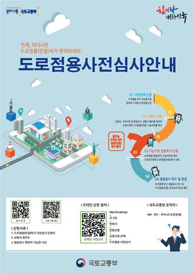 국토교통부(장관 김현미)는 민원인에게 ‘도로점용허가’의 가능 여부를 허가신청 이전에 미리 알려줄 수 있는 사전심사제를 QR코드, 스마트앱 등 비대면 기술을 활용해 확산한다고 밝혔다.