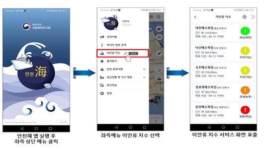 ‘안전해’ 앱을 이용할 경우, 왼쪽 상단의 메뉴에서 ‘이안류 지수’를 선택하면 8개 해수욕장의 이안류 정보를 확인할 수 있다. 또한, 관심 지역과 알람을 설정해두면 해당 해수욕장의 이안류 지수가 높아졌을 때 앱을 통해 알람을 받을 수도 있다.