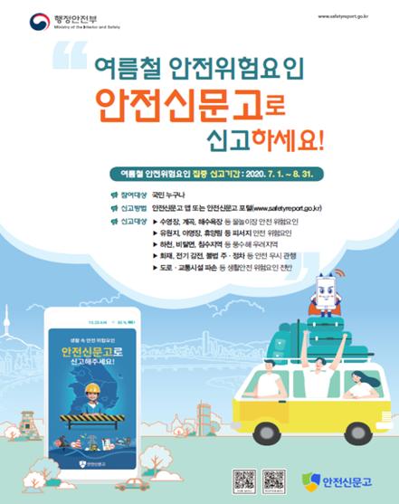 행정안전부(장관 진영)는 7월 1일부터 8월 31일까지를 여름철 안전사고 예방을 위한 ‘집중 신고기간’으로 정하고, 안전신문고를 통해 안전위험요인을 적극 신고해 줄 것을 당부하였다.