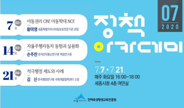 세종특별자치시(시장 이춘희)가 7일부터 21일까지 매주 화요일 오후 4시 시청 여민실에서 아동권리와 자율주행자동차, 적극행정을 주제로 7월 정책아카데미 강연을 진행한다.