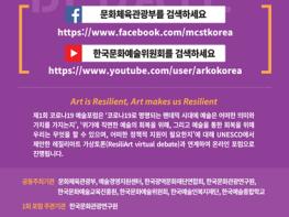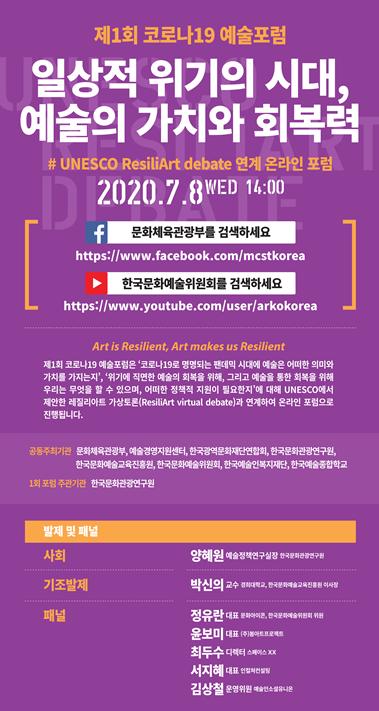 한국문화관광연구원이 주관하는 제1회 토론회(포럼)는 7월 8일 오후 2시, ‘일상적 위기의 시대, 예술의 가치와 회복력’을 주제로 유네스코가 제안한 ‘예술의 회복력 운동’(리질리아트 무브먼트, ResiliArt movement)과 연계해 열리며, 코로나19 확산 방지를 위해 관객 없이 진행된다.