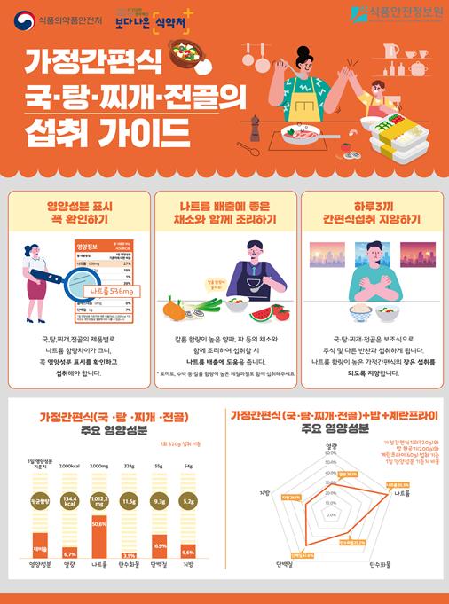 또한, 가정간편식을 먹을 때는 부족한 열량?단백질 등을 보충해주는 식품(예: 계란프라이)을 함께 드시고, 몸 속 나트륨 배출에 도움을 주는 칼륨 함량이 많은 파?양파 등을 함께 조리해서 나트륨 섭취를 조절하는 것이 바람직하다.