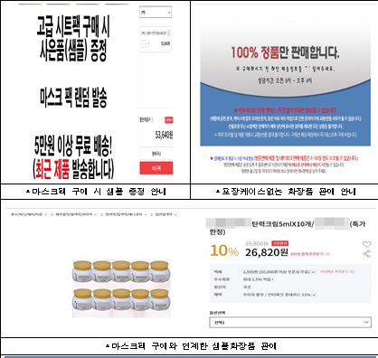 먼저, ▲견본품 화장품(샘플)을 불법 판매·유통한 7개 업소는 홍보·판매촉진을 위해 소비자에게 무료로 제공되는 견본품은 유료로 판매할 수 없음에도 ‘마스크 팩 화장품 샘플 증정’, ‘설○○, 아○○○ 샘플 증정’이라는 제목으로 소비자를 유인한 후, 단가 1천 원 미만의 마스크 팩을 본품으로 속여 판매하면서 유명브랜드의 견본품을 끼워 마스크 팩 1개를 1만 원 이상에 판매하다 적발되었다. 이는 겉으론 견본품을 사은품으로 끼워주는 것처럼 보이지만, 실제로는 판매가에 모두 포함해 견본품을 유료로 판매하는 매우 교묘한 수법이다.