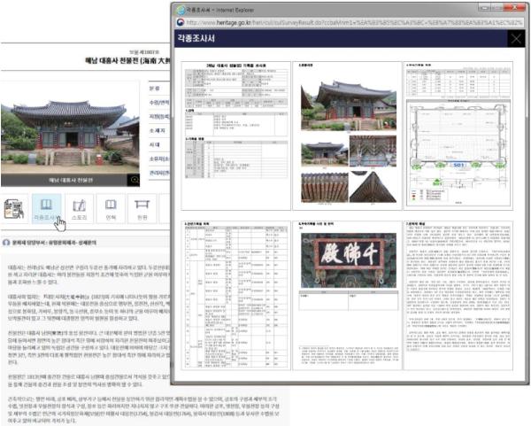 문화재청(청장 정재숙)은 국보·보물로 지정된 건조물문화재 622건(국보 87건, 보물 535건)에 부속된 기록물 1,485개, 관련된 기록물 4만 579개를 최초로 전수조사해 지난해 12월 수집을 완료했으며, 오는 12월까지는 관련 자료들의 목록화(데이터베이스, DB)를 구축하여 통합적인 보존관리 기반을 마련하기로 했다.