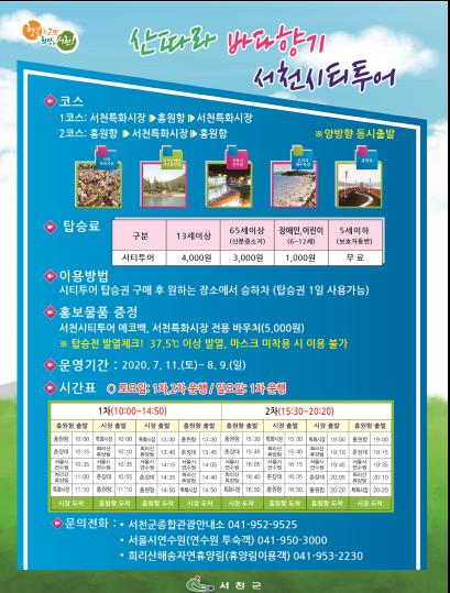 산따라 바다향기 서천시티투어의 운영 시간 등 문의 사항은 서천군 관광안내소(041-952-9525)로 전화 문의하면 된다.