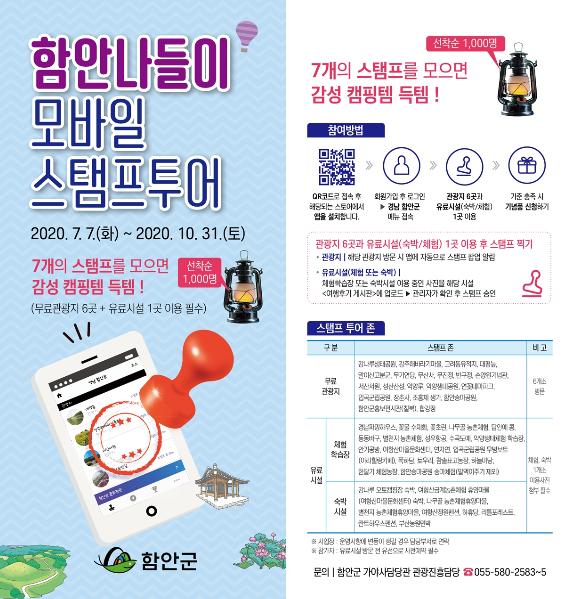 모바일로 진행되는 이번 스탬프투어에 참여하기 위해서는 구글 플레이스토어 또는 애플 앱스토어에서 ‘스탬프투어’를 검색, 내려받기를 하여 회원가입 후 ‘경남 함안군’을 선택해 참여하면 된다.