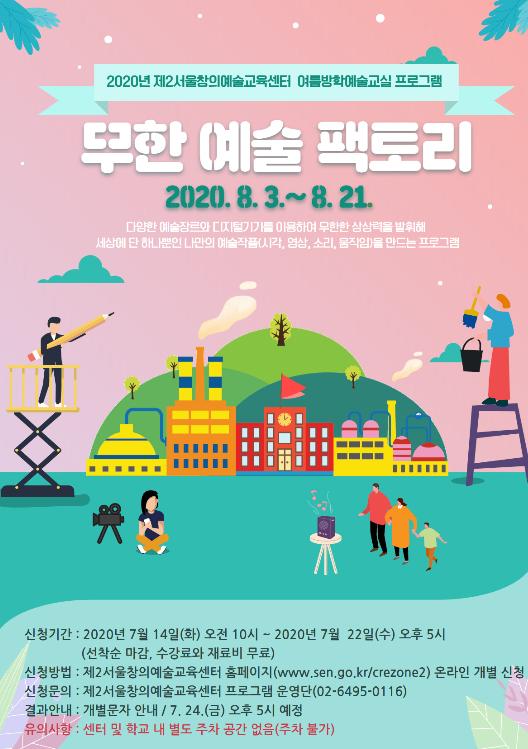 여름방학 예술교실 「무한 예술 팩토리」는 8월 3일(월) ~ 8월 21일(금) 동안 운영되며, 신청은 제2서울창의예술교육센터 홈페이지(http://www.sen.go.kr/crezone2)를 통해 가능하다. 신청 기간은 7월 14일(화) 오전 10시 ~ 7월 22일(수) 오후 5시로 선착순으로 접수가 마감된다.