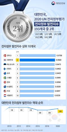 행정안전부(장관 진영)는 국제연합(UN)이 10일 10시(한국시간 7.11일) 뉴욕 본부에서 발표한 2020년도 UN 전자정부평가에서 우리나라가 193개 회원국 중 전자정부발전지수 2위(1위 덴마크), 온라인참여지수 공동 1위(한국, 미국, 에스토니아)를 기록하였다고 밝혔다.