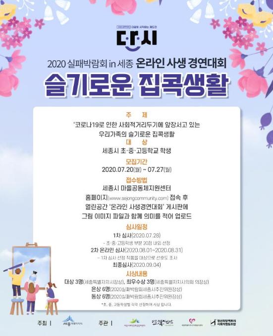 한편, ‘2020 실패박람회 in 세종’은 실패를 끝이 아닌 성공의 과정으로 인식할 수 있는 사회 분위기를 조성하기 위해 열리며, 실패사례모집, 실패사례 경연대회, 응원 댓글 이벤트, SNS이벤트 등이 진행된다.