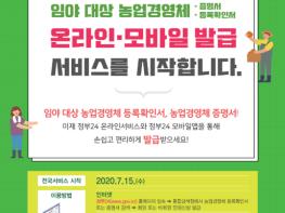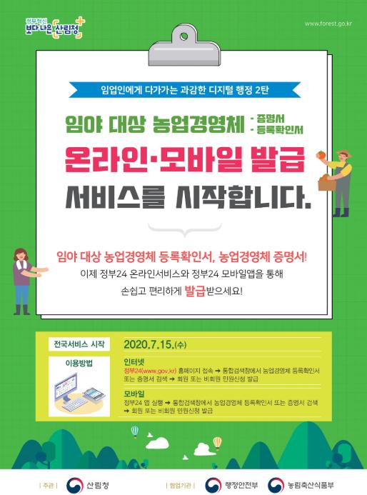 산림청(청장 박종호)은 7월 15일부터 온라인 발급 서비스와 이동통신 앱 서비스를 통해 임야대상 농업경영체 등록 확인서 및 증명서를 임업인이 편리하게 발급받을 수 있도록 비대면 서비스를 시작한다.