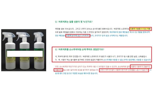 이번에 적발된 업체는 기구등 살균소독제를 ‘손소독제’, ‘손세정제’, ‘손세척’ 용도라고 판매하면서, “실수로 마셔도 인체에 안전”, “온몸에 사용”해도 된다고 거짓·광고했으며,