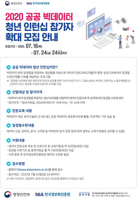 올해 상반기 100명을 선발한 “공공빅데이터 청년 인턴십”에 1,543명의 청년들이 지원하여 높은 관심을 보인 점을 고려하여 3차 추경으로 청년 인턴 600명을 추가 모집해 빅데이터 전문인력 양성을 확대하기로 했다.
